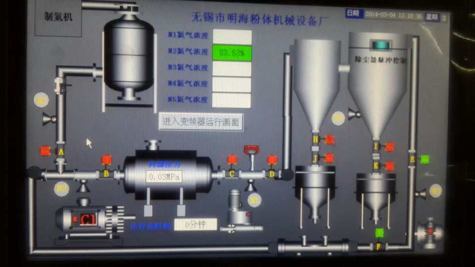 本设备采用闭式循环研磨方式,为防止粉末氧化等情况发生,内部冲入惰性气体保护,并安装冷却风装置、水冷装置、降噪装置、冲氮含量装置、控制内部压力装置,并可在密闭状态下出料。